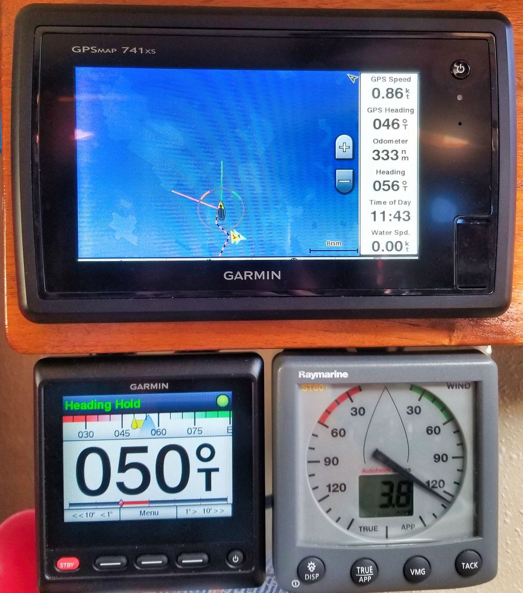 By noon Southern Light was simply drifting along with the ocean current in a few knots of wind. Fortunately that current was in the right direction. The wind instruments are mounted on top of the mast which creates false readings while swinging side to side.