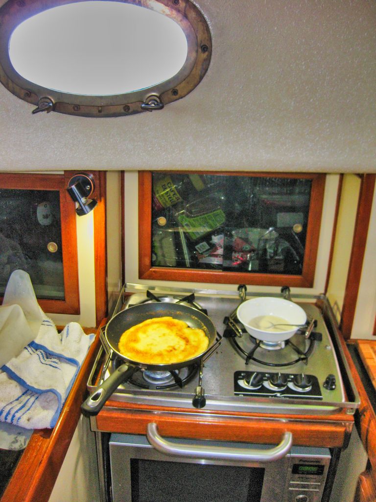 Breakfast! The wind steadily increased along with my appetite. It is very difficult and dangerous to cook on the stove in high seas. The stove and microwave are gimballed but I'm not. Trying to remain upright with damp feet on a gloss varnished sole (interior floor) can be challenging. Pushing my limits to stay upright I enjoyed a nice omelette with grits but this was my last stovetop meal for a while.