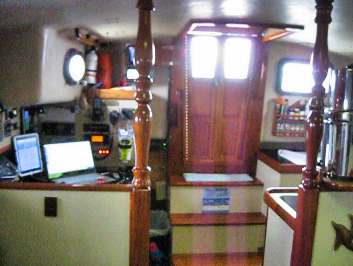 The wind and seas kept increasing. Mentally I was in uncharted territory as they say. Bouncing around like a cork made it extremely difficult to move around so I wedged in the navigation seat to help prevent injury and watch the instruments progress. It was extremely dangerous to go outside however I would poke my head out the companionway hatch periodically to check for anything in need of attention. It's hard to tell from photos but only a dire situation would have driven me to go on deck.