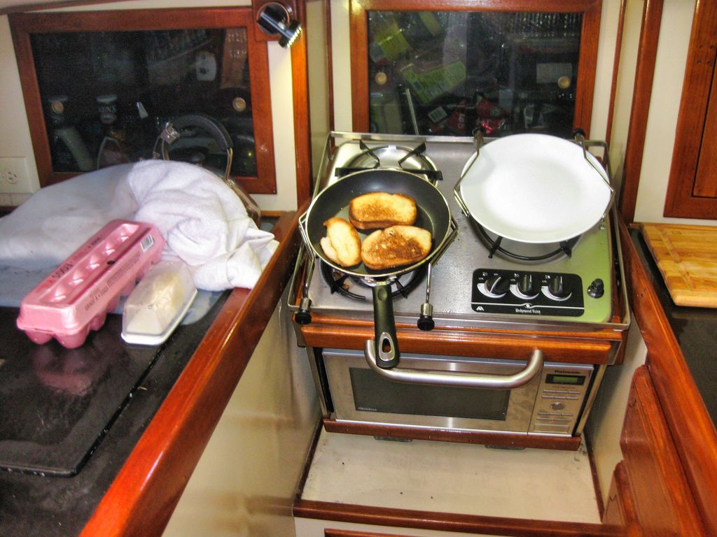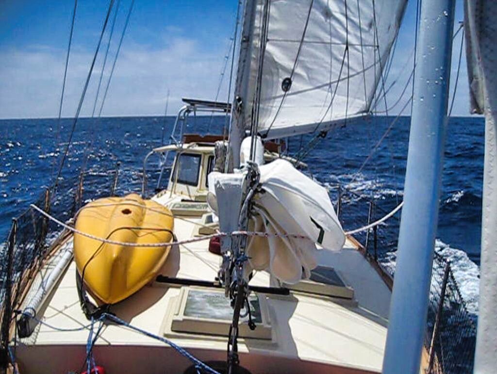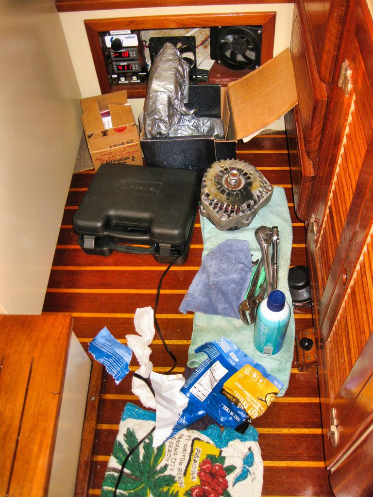 Taking the alternators apart on a moving sailboat was quite the challenge with screws and small parts bouncing around. Old towels laid on the galley sole (floor) made for the best work area. The narrow space kept me from banging into something sharp while working nearest the center of movement.