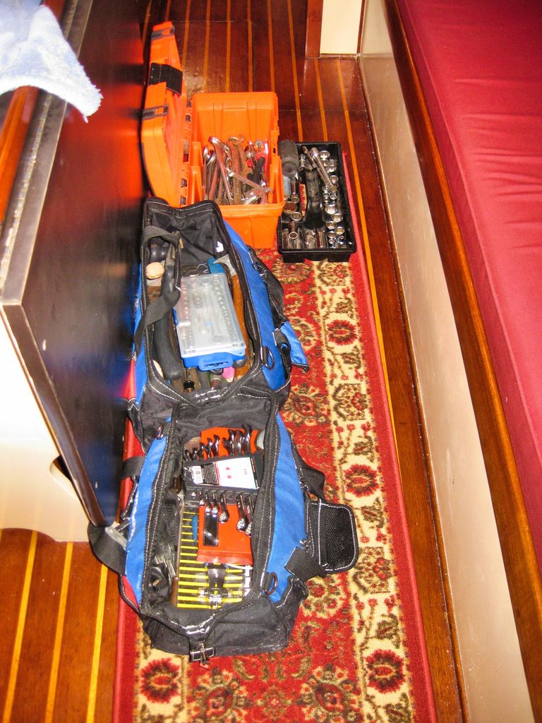 Getting all the tools needed for the job was not an easy task. Heavy tools were located on a platform just over the bilge area. They were secured in place by netting and lines requiring body contortions to reach while hanging upside down through a small floorboard.