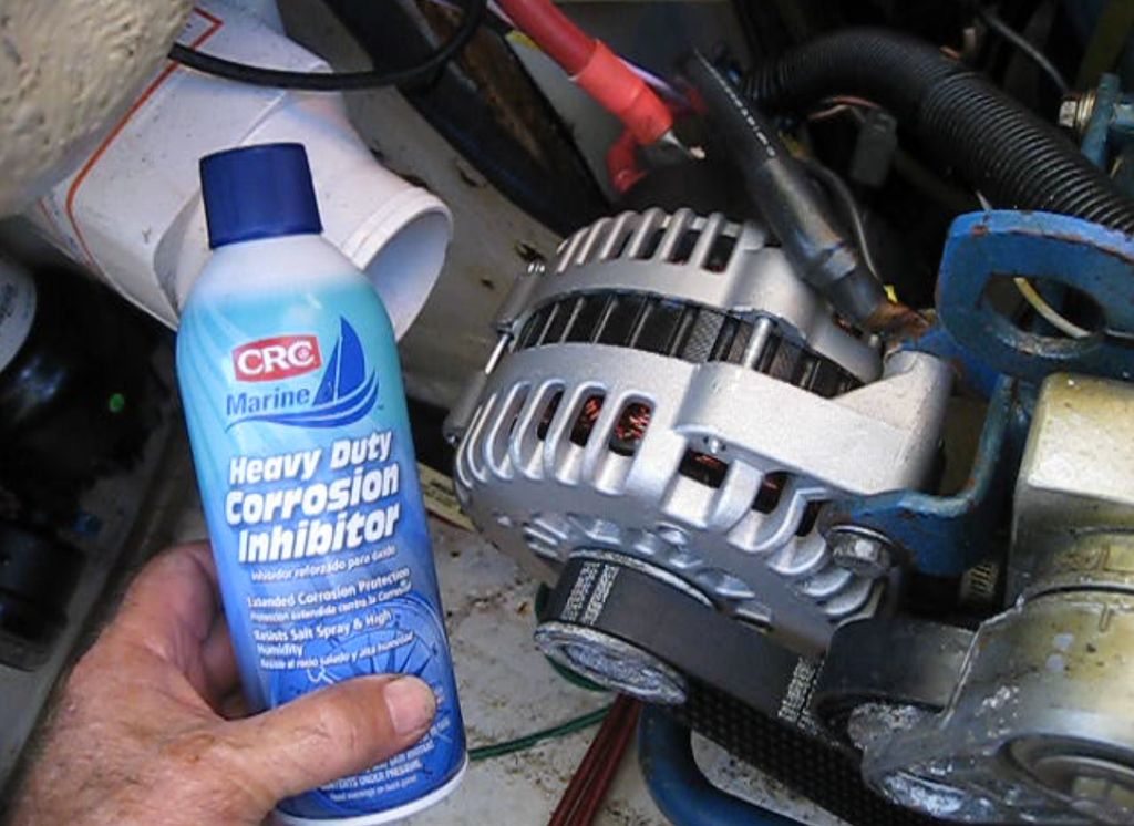 Having finally installed the new alternator in the middle of the Atlantic I sprayed it well with CRC corrosion inhibitor.
