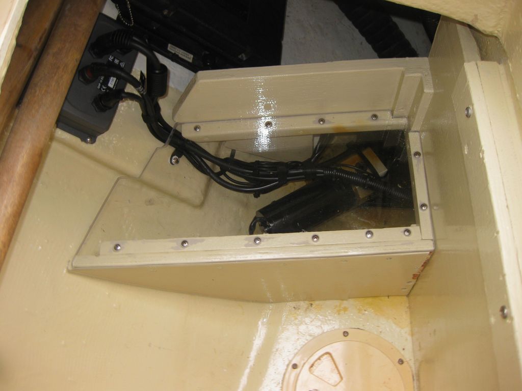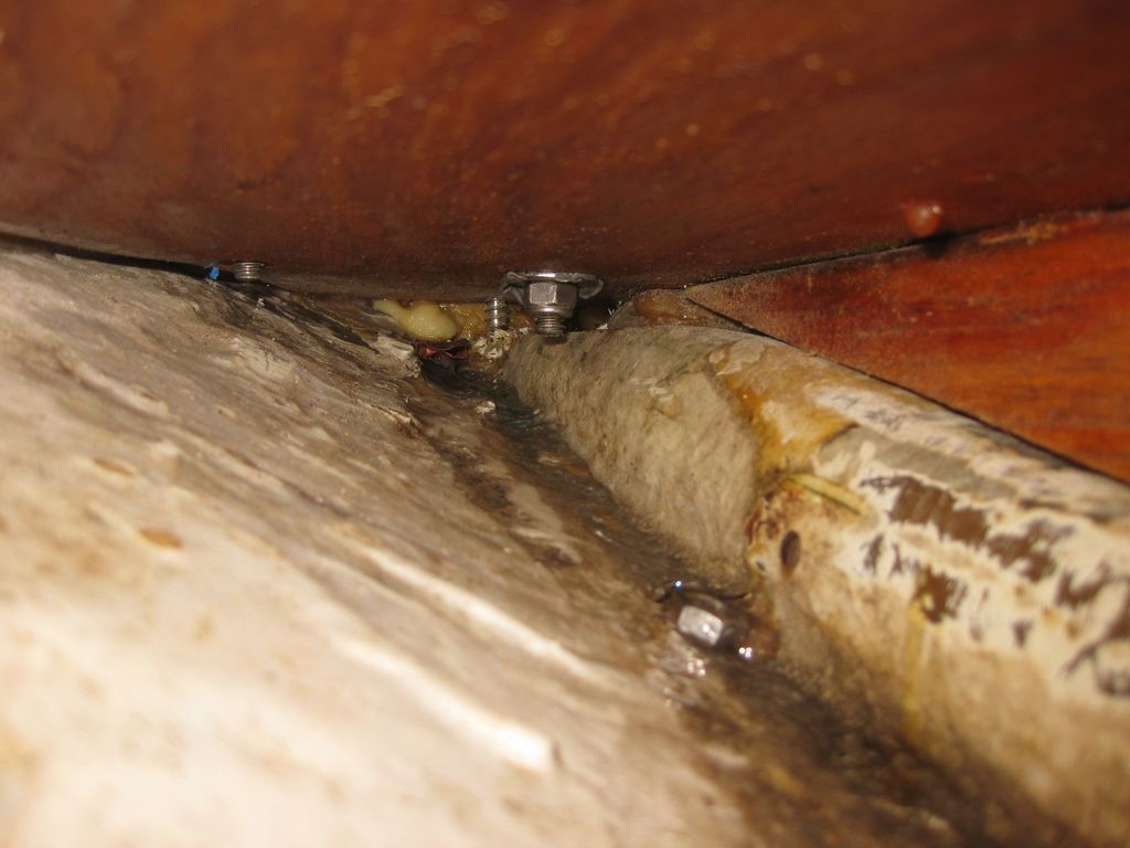 I temporilarrly packed the corner wedge area with butyl rubber until the leak stopped. I would do a permanent repair on a non moving boat later in port. While in this area I tightened up all the bolts and applied loctite thread locker. My fingertips would not reach so I glued the nut on a paint stirring stick corner getting it started, finally tightening with an open end wrench. No more leak!