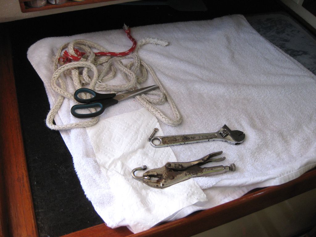 A shackle had come loose and bent open. Fortunately I had installed extra padeyes earlier in the voyage for this very reason. It was a very dangerous process to lasso the wildly swinging boom and tame it. I then dug through misc hardware to find a replacement shackle. All along the deck was trying it's best to throw me off or knock me out.