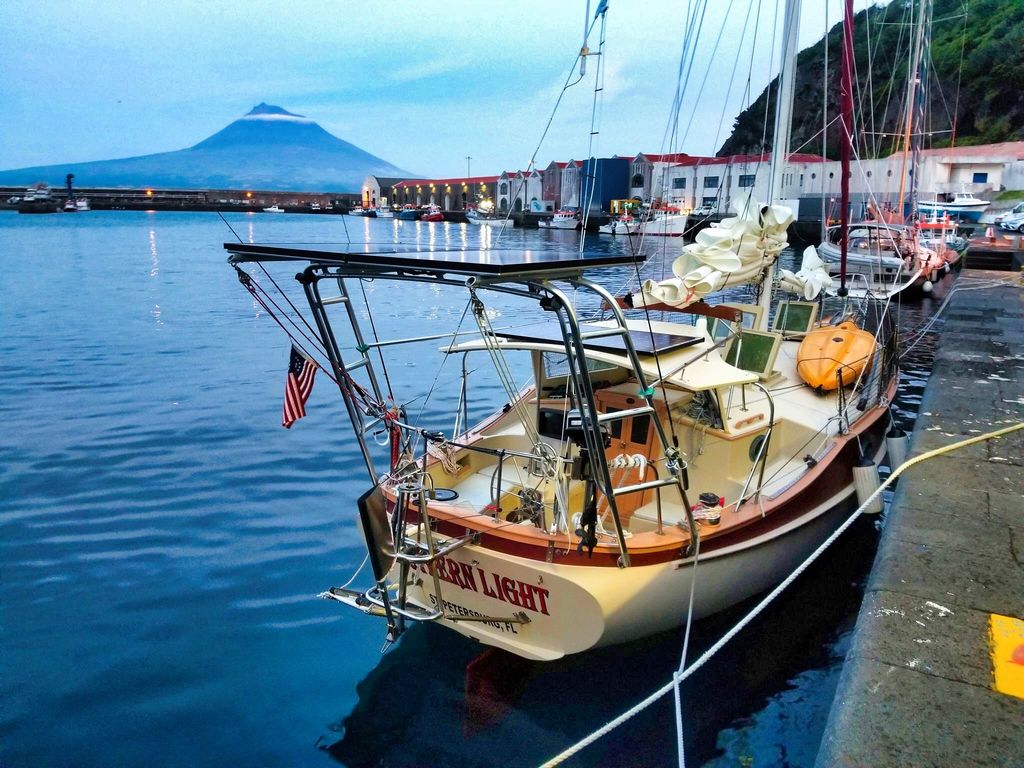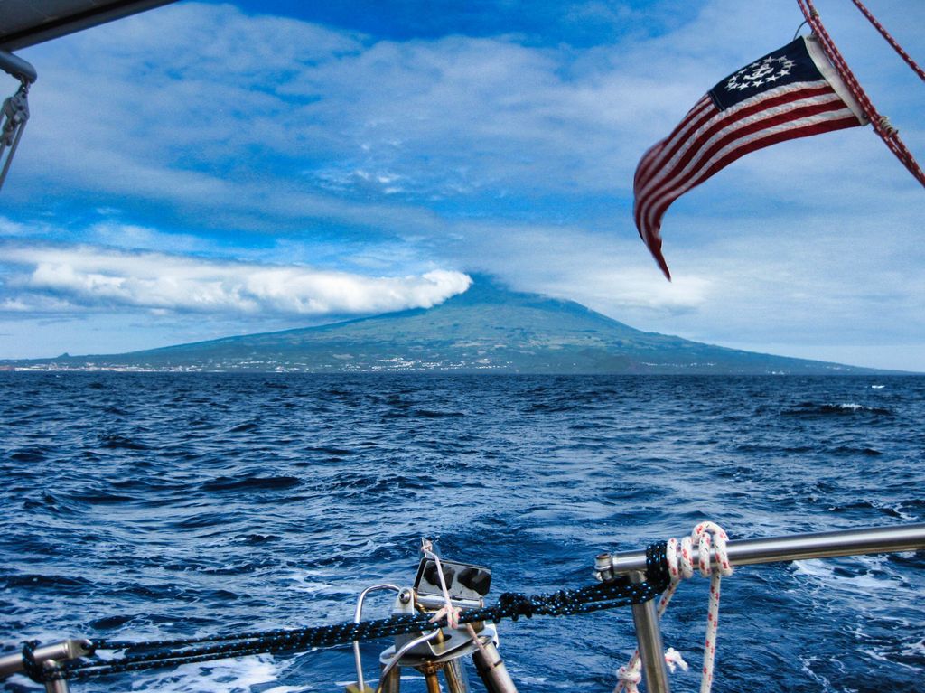 Turning back West and into Horta Harbor. Pico island in the background.