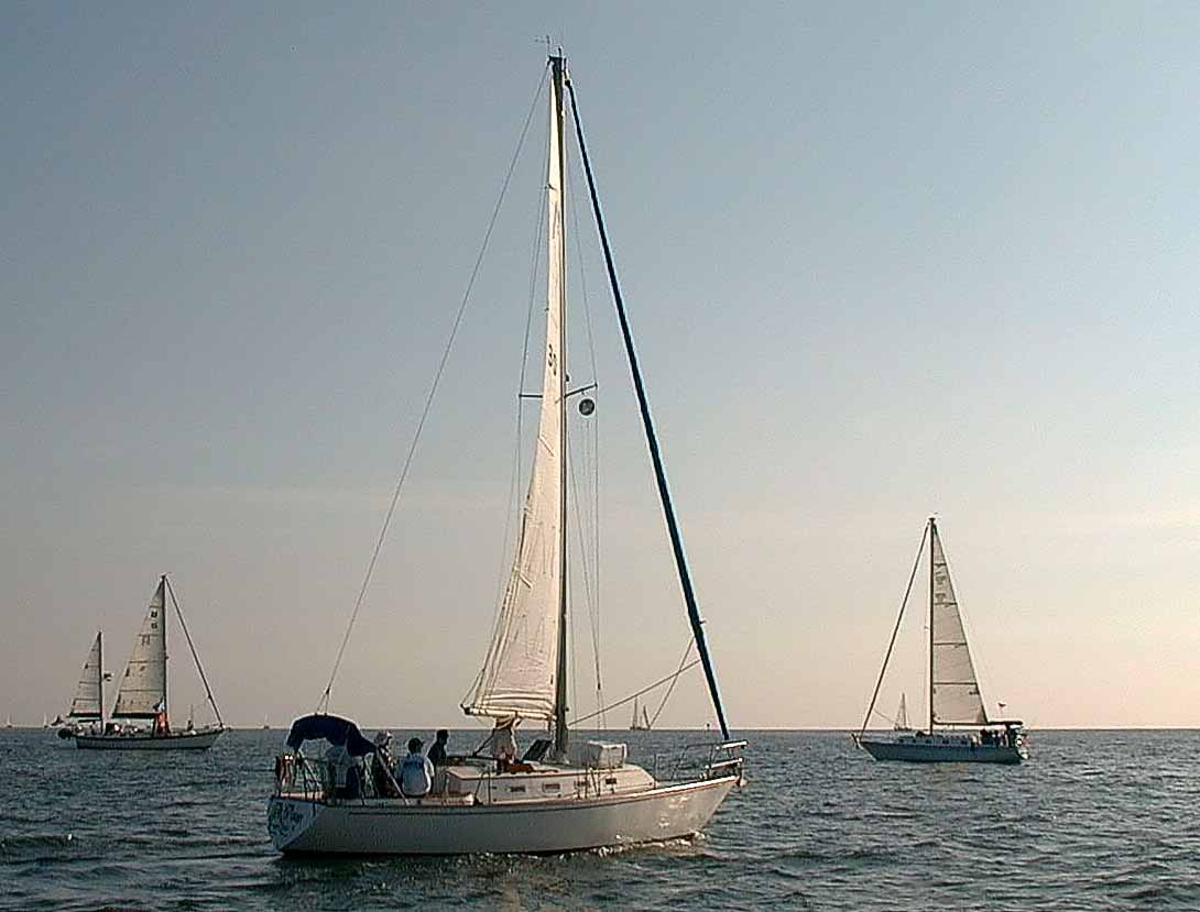 Just out of Tampa Bay headed South off of Anna Maria Island. Katsy II with huge spinnaker up. We beat out of the Bay and were doing great but Mr.Hoot being a light weight racer was becoming overpowered with our #3 spinnaker heading down the coast. All we could do was watch Katsy II run away with her heavy ballasted keel. We kept up fairly well with a 170% genoa for a while.