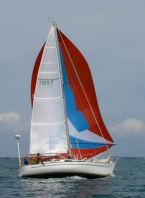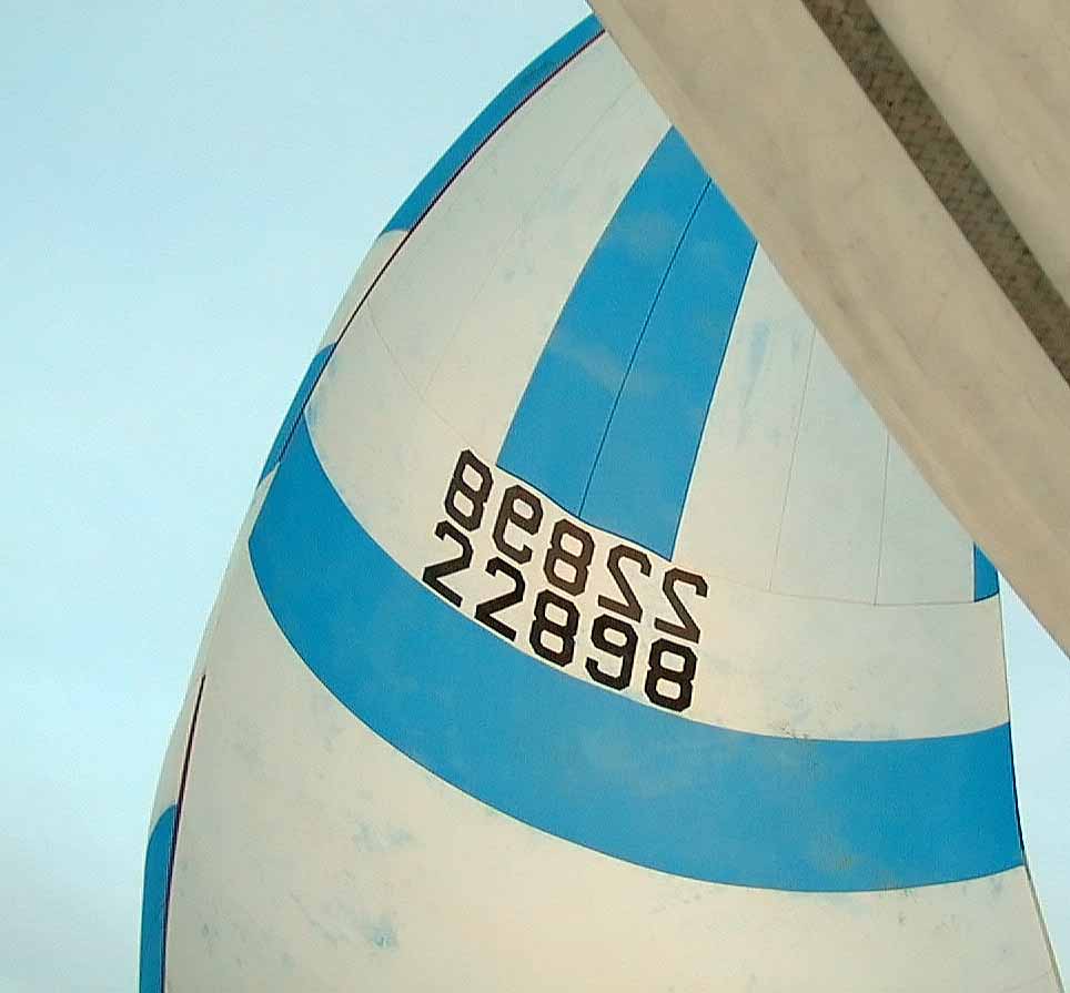 Spinnaker is still full,,,looking a little tie-dyed from wet packs over the years. Still a very good sail and the condition I bought it!