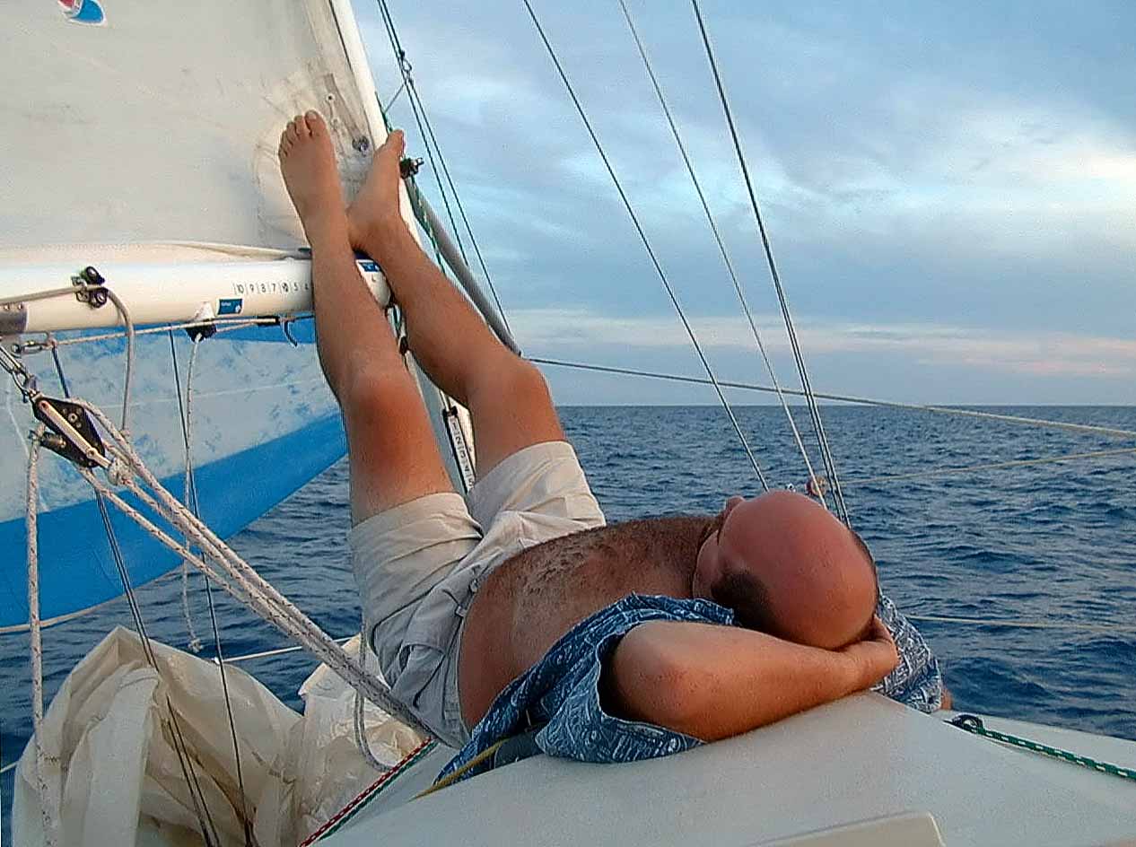 The wind has backed off considerably and we have the largest of our three symmetric spinnakers up. I think JJ is keeping a shut-eye on the spinnaker trim here...
