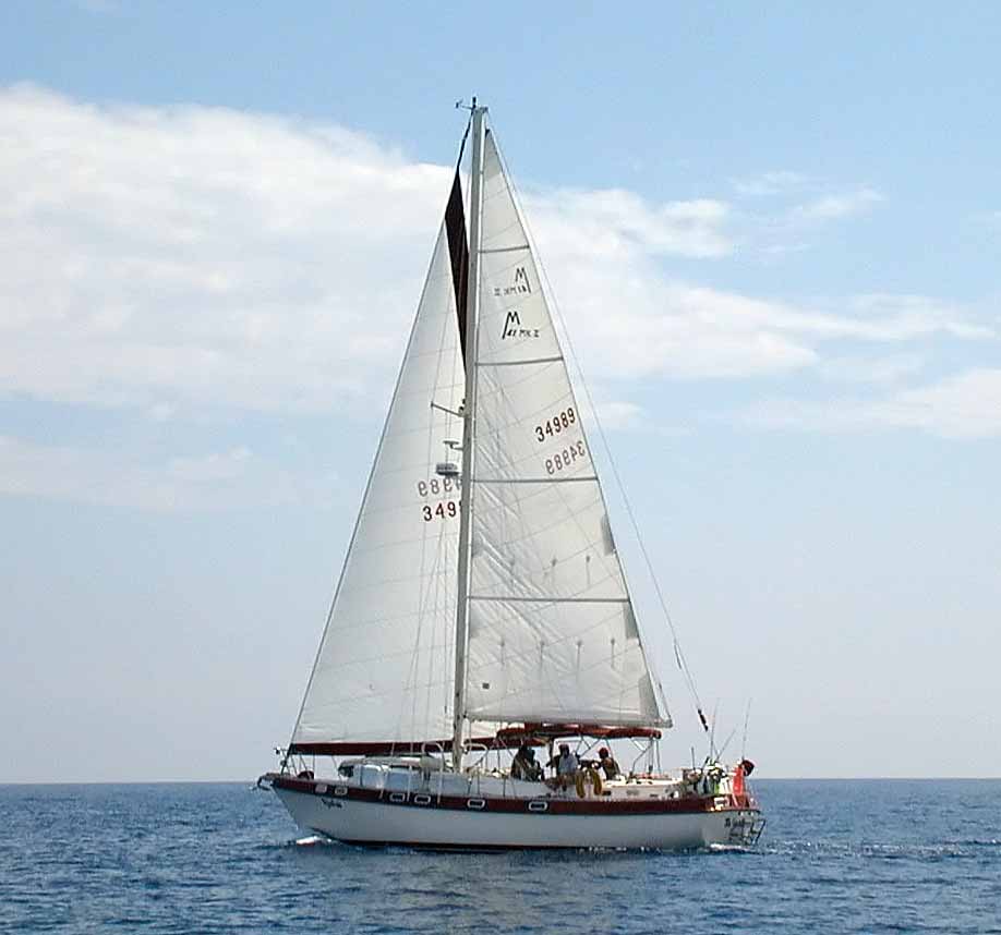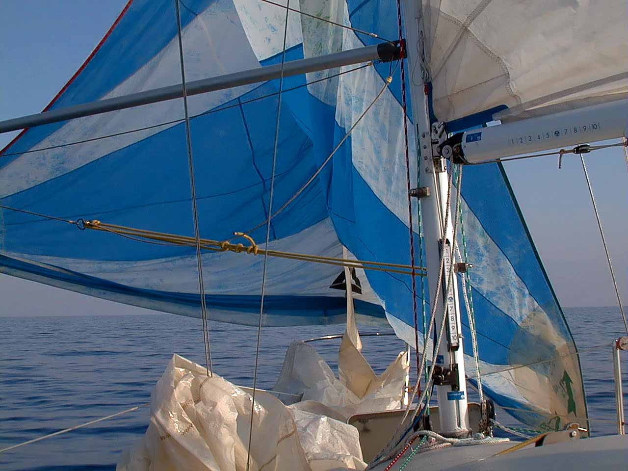The wind is getting lite and we are down to a few knots. This Morgan Out Island 41 sloop fired up its engine and tossed in the towel. It is difficult wallowing around out here in the middle of nowhere. We talked to them on the VHF radio, they were having a power party! We decided to keep trying but the forecast was for dead calm.