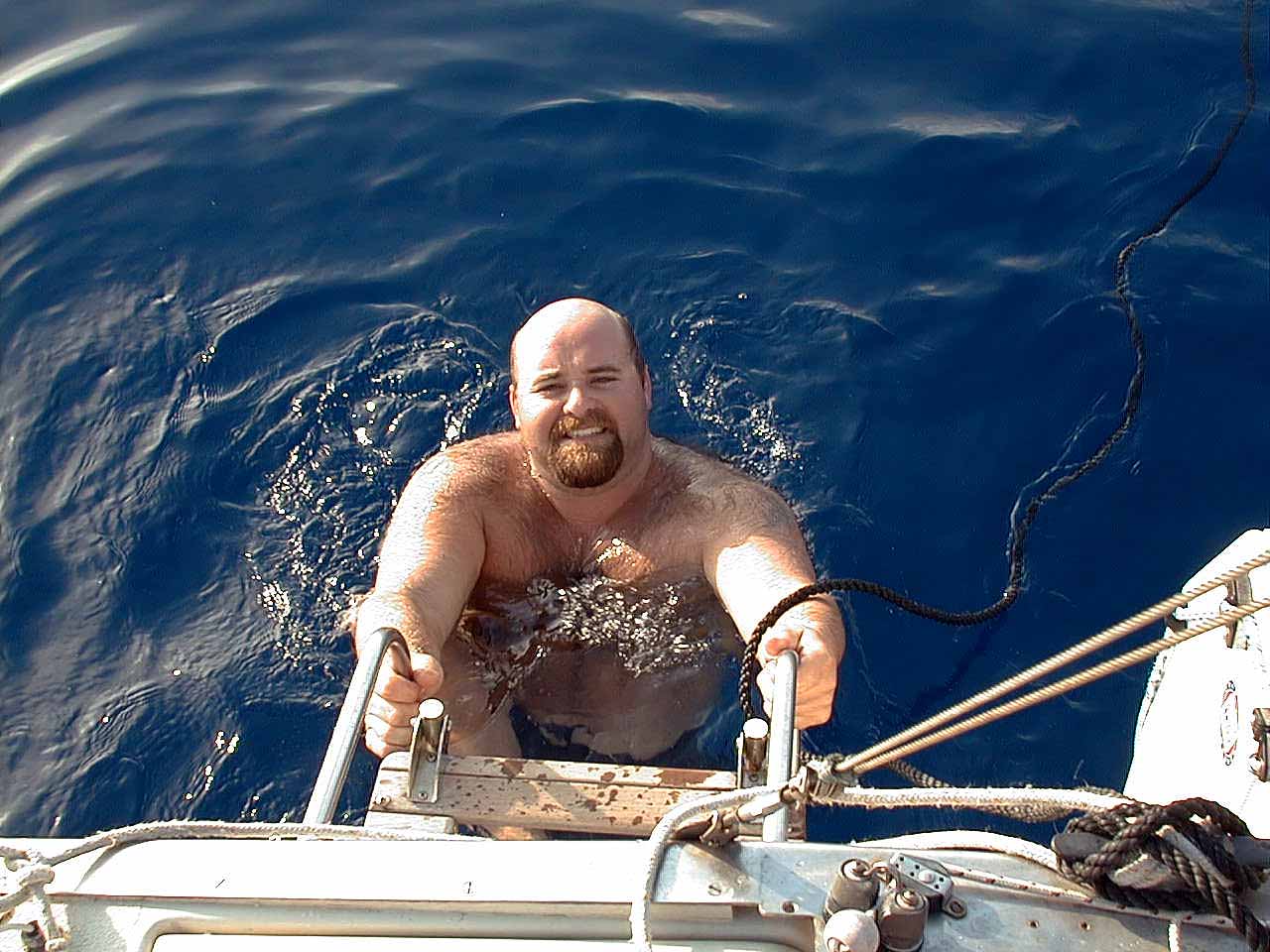 The wind is almost to nothing so JJ and I decide to cool off and take a dip. The Gulf is 150' deep here, we toss a floating line just in case the boat were to mysteriously take off and in we go! This is a welcome relief from hot and sweaty. A little Sea Soap (Joy Dish Detergent) and we are good to go...another 30 minutes anyway. Joe is on watch... JJ and I swim around the daggerboard where one little fish is hanging out. I put on some fins and try to push the boat for a little progress. Think I hit .1 knot,,,yep we are really cranking now. Here is JJ climbing back aboard. Check out the color of that water...and it is crystal clear!