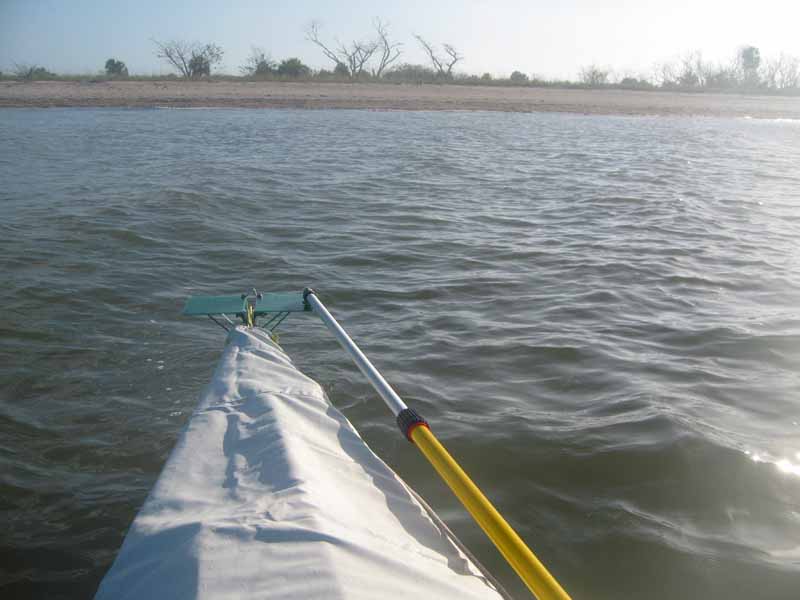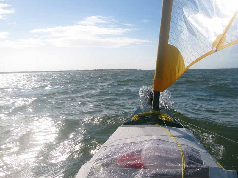 Furled sail and doing about 4 knots but not in the direction I want to go. I'll be tacking quite a few times. It is not easy to tack in these winds and I sometimes must use the paddle to help get the nose through the wind. I would not want to be out here in a standard canoe in this wind and waves.