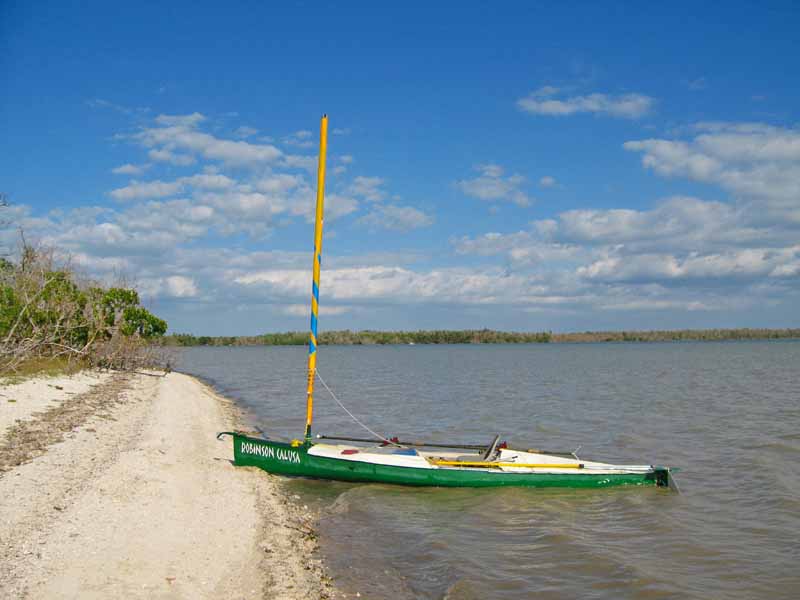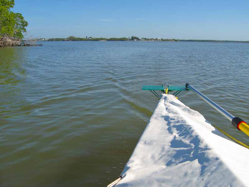 Round Rabbit Key and slowly ease South down the coast. The east wind is slowly tapering off so I paddle sail to maintain 2 knots. The wind is totally gone within the hour so I furl up the sail and paddle then it slowly starts to fill from the west. Within another hour I have a west wind (sea breeze) and sailing along at a nice 3 knots, an hour more and Calusa is in the 5 Knot range. I ask Steve to please ask the wind gods to steady off now "enough" and the wind speed holds true. Thank You Steve.