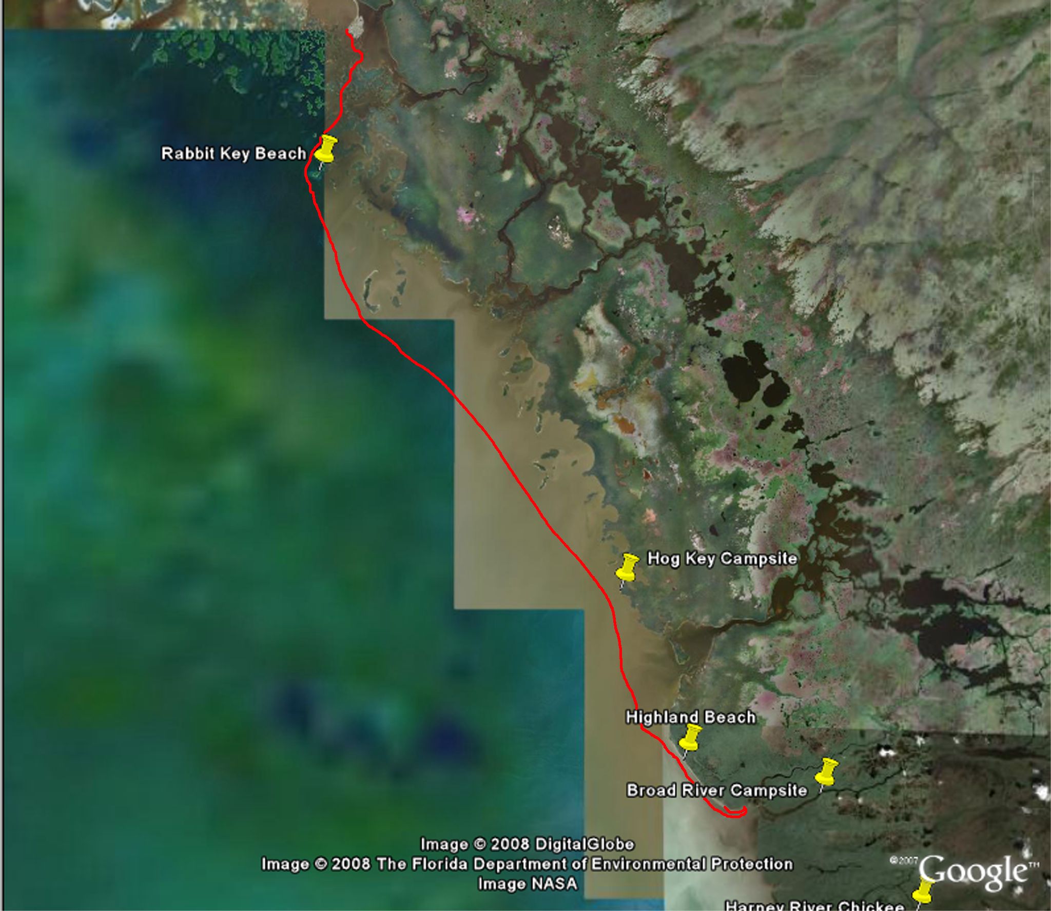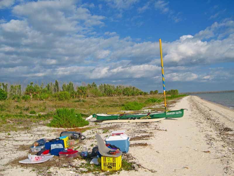 Walked down to the boat ramp to check out Robinson Calusa and all was well from a night alone. The Chokoloskee Island Park boat ramp was a busy place this morning so I zipped back to the overnight pad and hurriedly fried some bacon and eggs. It was a short stay and I was not actually in the place very long but it had to be done. I really did not want to come back to civilization for the entire adventure but thought I may need to resupply my fresh water here. My water supply was holding out much better then expected but the repair was necessary for some peace of mind. I just don't see duct tape, rocks and shells getting along together for very long. The temp repair is complete and I'm anxious to get back out in the Everglades Wilderness so I launch between power boats and load in a hurry.