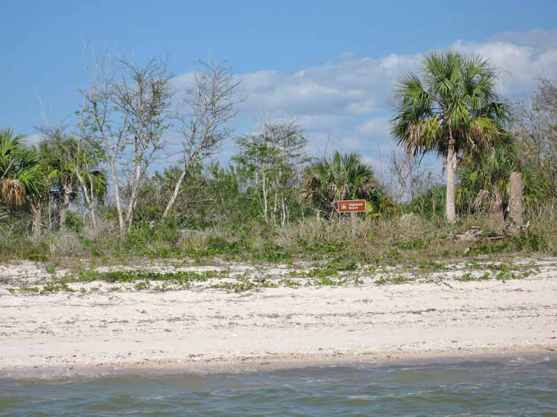 Just beyond the NPS sign is a nice oasis looking clump of palm trees, darn, two power boats are already there. Getting closer I see at least 8 tents setup amongst the palms. Beautiful spot for a camp but I head on down the long beach slowly bending shoreline until their camp is out of sight. I spot a few trees ahead but there are more tents, darn it again, I'm wanting to stop here and setup camp early today. A little further to a point that looks good, no way, more tents with no boats or humans around.