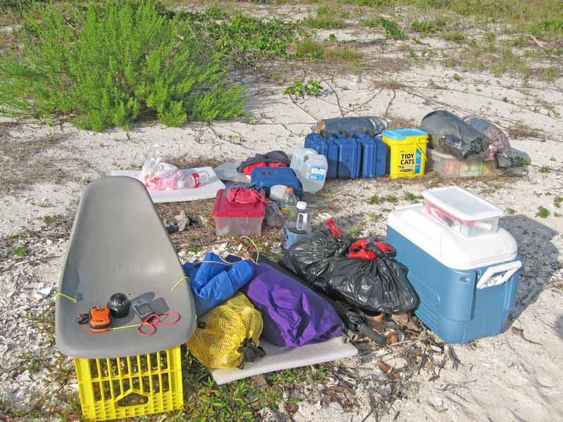 This is how I start setting up. Try and find some dead grass to set supplies on, sand gets into everything so I try and mitigate spreading it around. I find a flat spot and move all the little sticks and shells out from where the tent footprint will be. Setup the tent, it's very easy and fast, then move the dry stuff inside - but no food! If you have food in your tent animals will tear it up trying to get at it. I also keep garbage in a plastic bag at least 20 feet away preferably hanging from a tree limb. This makes it more difficult for critters to inspect. The rest I set under the canopy or vestibule. I always lash the opening tops of the cooler and food containers with Kevlar line. Crittters would have a very difficult time chewing through Kevlar.