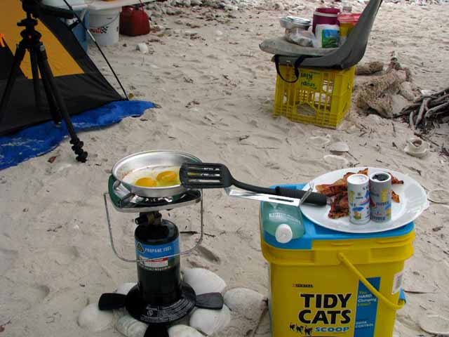 Ahh yes, bacon and eggs for breakfast, again! It is very similar to a circus balancing act trying to keep cooking utensils out of the sand, no kitchen counter here. This is the same cheap little propane burner used on last years adventure but this time I only brought one tank instead of four.