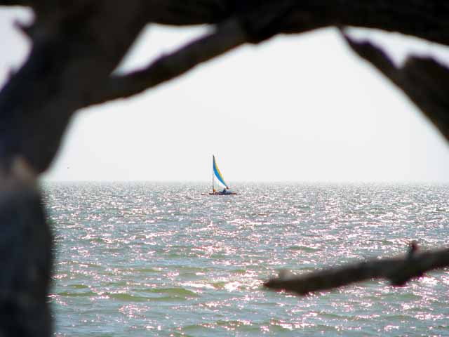 I'm sitting at camp contemplating what the next few days will hold when I catch a glimpse of a sail on the horizon. Not just any sail but a Hobie Adventure Island sail. I know the color and shape all to well as it is the same as 'Robinsone Calusa's' own sail. I have never actually seen one under sail other than on YouTube so I was watching with keen interest hoping it would pull in so I could chat with the captain. I walked out to the West end and took more photos but it never got real close. It was tacking into the wind which was picking up pretty well about now. I was thinking how wet this person must be out in those waves. Anyway it sailed on and off of my radar.