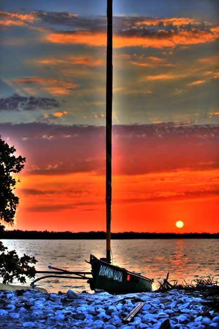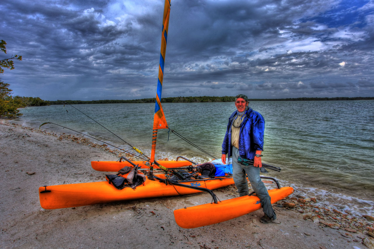 Wow, I'm so into photographing that I don't notice that the Hobie AI returned to the island. This is a shot of Bob Quirk just after landing from a rough sail to weather and back. Bob is the captain of the Hobie AI (Adventure Island) that I had photographed earlier in the Gulf. He was soaked as expected but in very good spirits. Its a treat to see someone enjoying this wild, rough, and adventuresome life without complaining. Bob had pushed his vessel near its limits today so I moved on and left him to dry out and setup camp. Nice AI rig Bob - I could not believe the amount of gear he had on that AI. Click here for Bob Quirk's Everglades Camping Trip Site - Check it out!