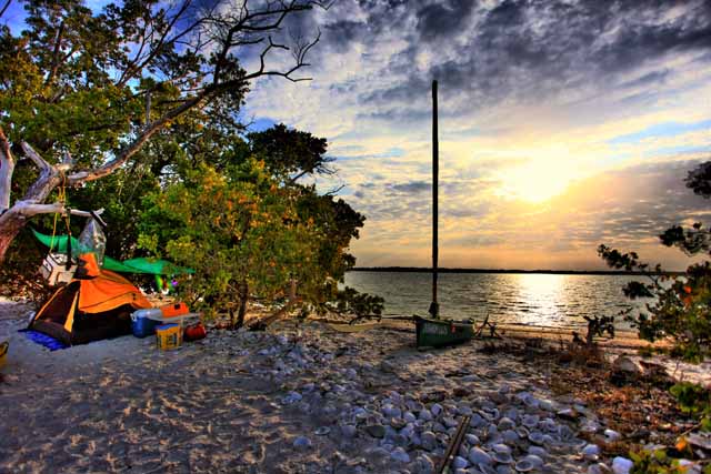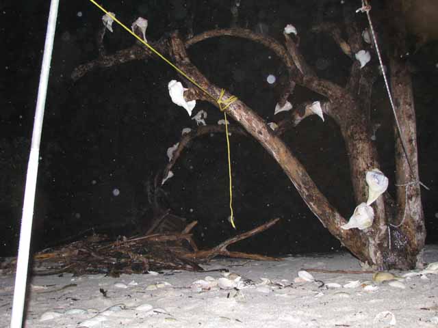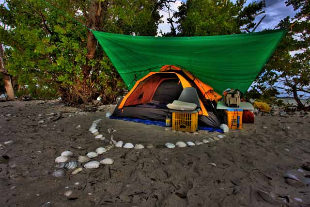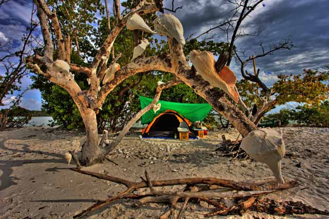 My camp was in need of a little art and with all the Calusa Indian shells around why not. I started off by placing the larger conch shells on the nearby dead tree stubs, then an arch in clam shells around the tent as seen here. The arrow points to my next destination, Pavilion Key, and the conch in the center is the sight alignment.