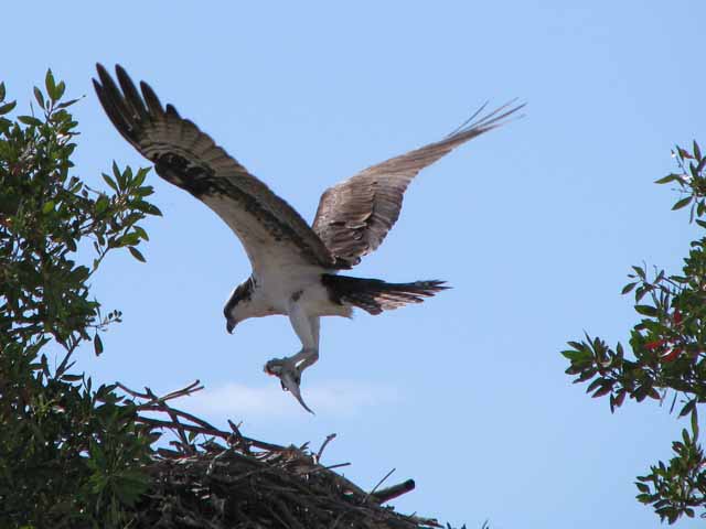 This osprey family kept me entertained most of the time around camp. The family had setup house within 25' of the island port-o-let in a live mangrove. They had a small chick deep down in the nest. I could never actually see it but could hear the little peeps. Dad would perch nearby and cater to moms every whim. Fish, honey I need a small fresh fish for youngster. Yes darling, and off he would go. They have a language in the tone of their chirp. Dad would fly back with the takeout order and hand off to mom then a order for a long piece of wood for additional house protection. After his chores were complete he would have his own meal always at a nearby tree. Any time other birds would get in the no-fly zone dad would chirp and attack if close enough. I once watched dad chase a vulture 1/2 mile away to another island, and it was not a casual escort service. Osprey's talons mean business!