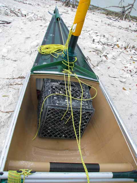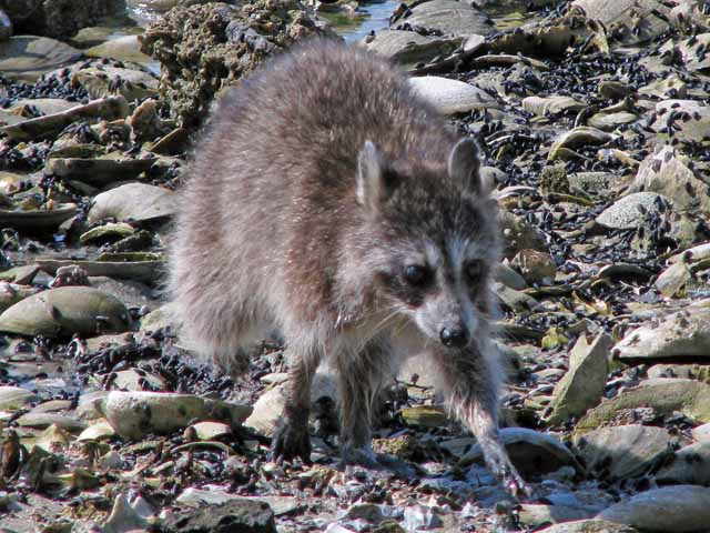 Most raccoons are nocturnal and forage in the dark but here they must work with the tides to survive. Still they will check out your camp for easy pickings. I have found the safest place for my backup fresh water supply in the bow of the canoe. I tie a milk crate tight to the opening and have not had problems to date. Yes, they try and get in and track lots of sand around in the boat but the fresh water stays safe. I have heard stories of rats getting into fresh water supplies and I have seen a few on the beach at night but 'knock-knock' no problems, yet!
